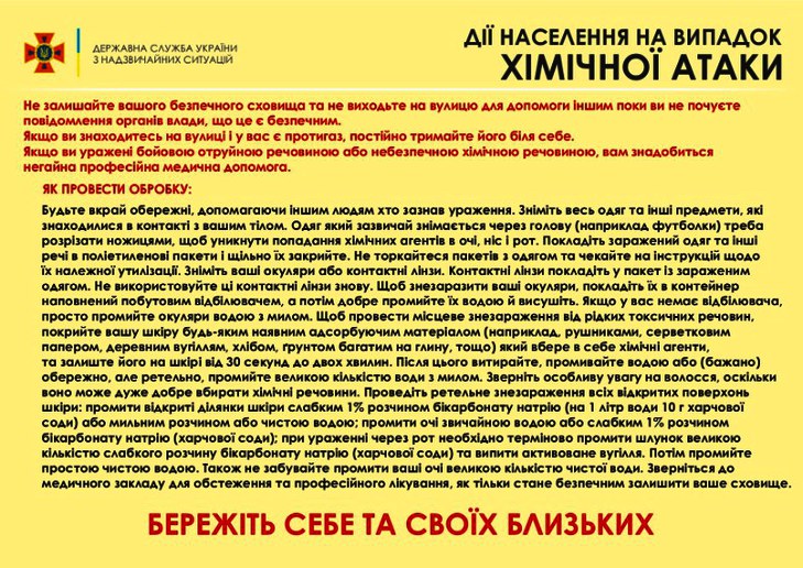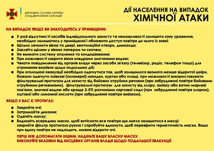 • Знайте, що вражаюча дія конкретної небезпечної хімічної речовини на людину залежить від її концентрації у повітрі та тривалості дії, тому якщо немає можливості покинути небезпечну зону не панікуйте і продовжуйте вживати заходи безпеки.